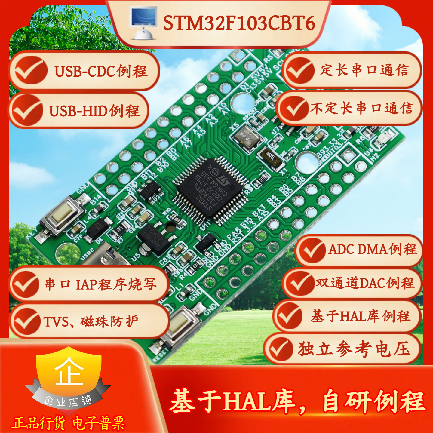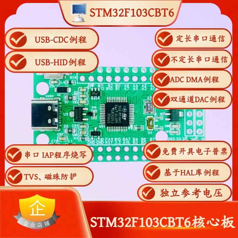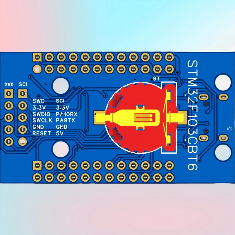 STM32F103CBT6微型开发板,ADC参考电压独立供电,不受负载影响。STM32F103CBT6微型开发板背面预留CR1220电池座,客户在需要的时候,可以自行焊接。本案提供以下例程: