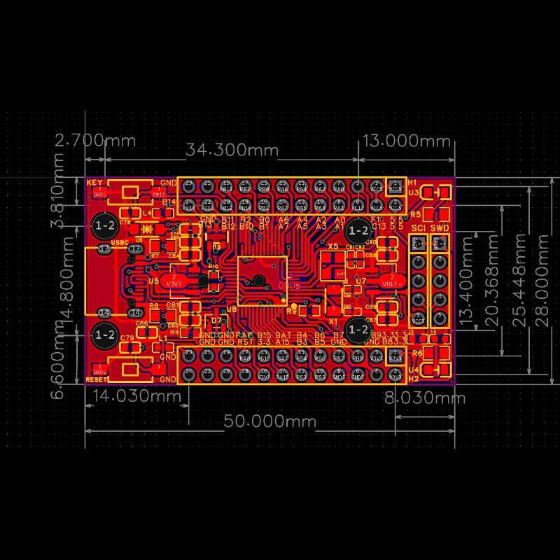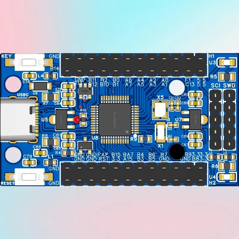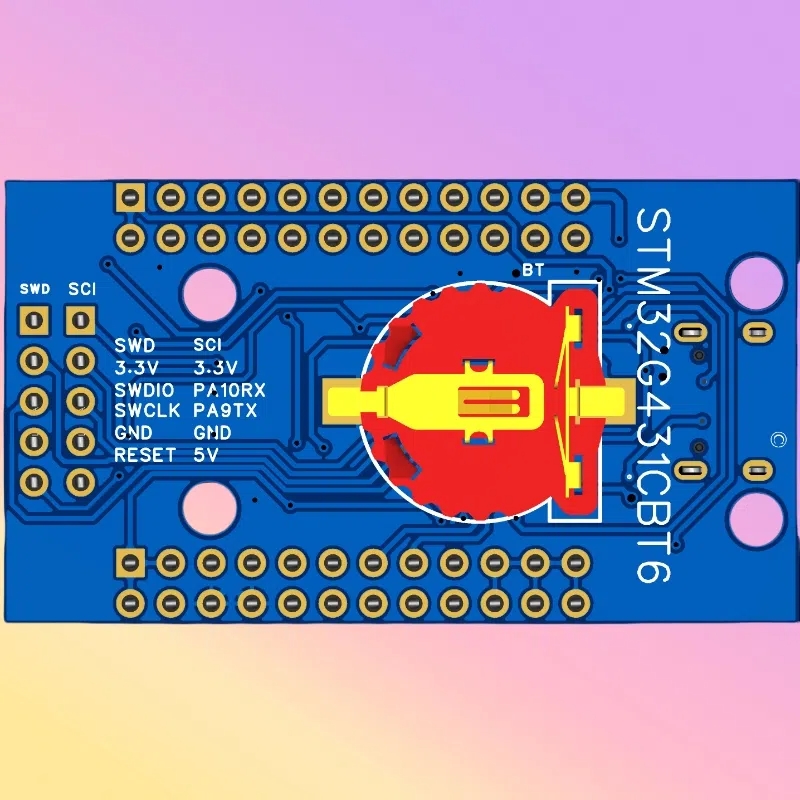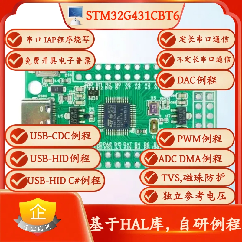 STM32G431CBT6微型开发板,ADC参考电压独立供电,不受负载影响。STM32G431CBT6微型开发板背面预留CR1220电池座,客户在需要的时候,可以自行焊接。本案提供以下例程: