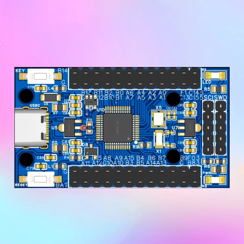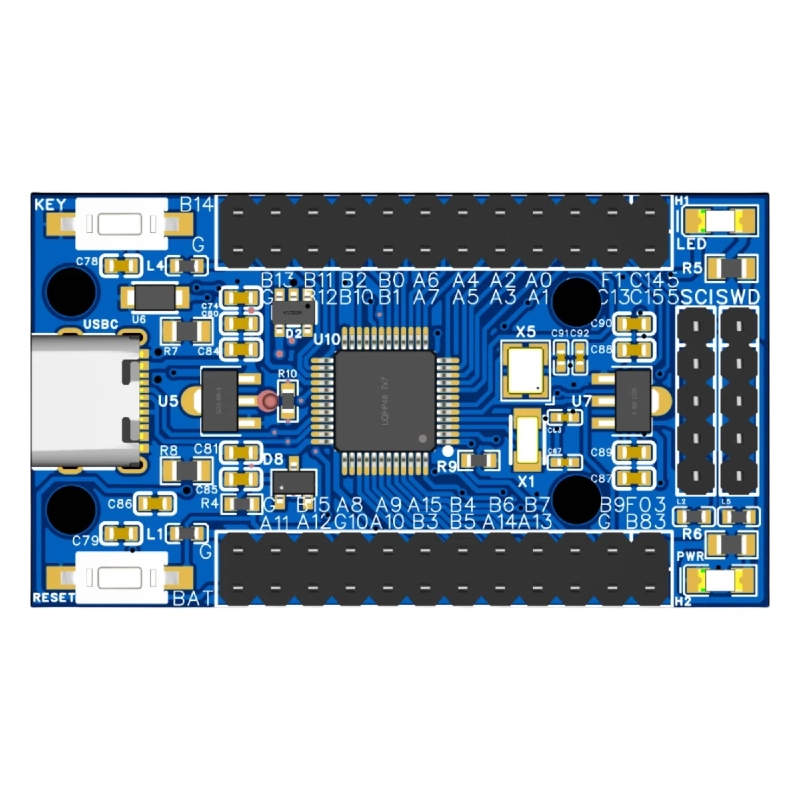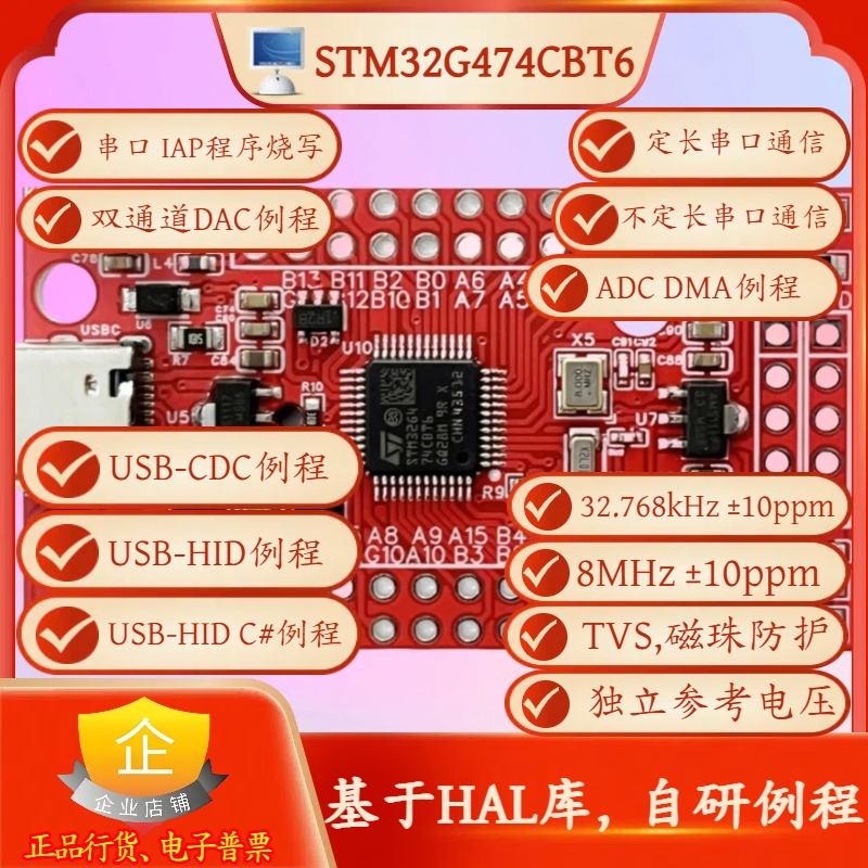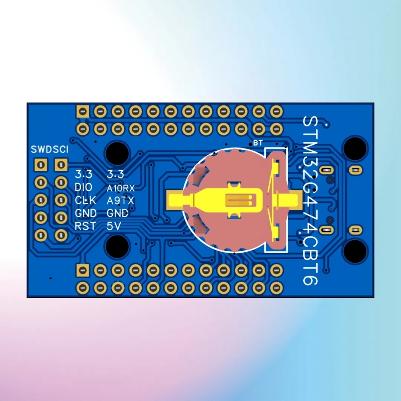 STM32G474CBT6微型开发板,ADC参考电压独立供电,不受负载影响。STM32G474CBT6微型开发板背面预留CR1220电池座,客户在需要的时候,可以自行焊接。本案提供以下例程: