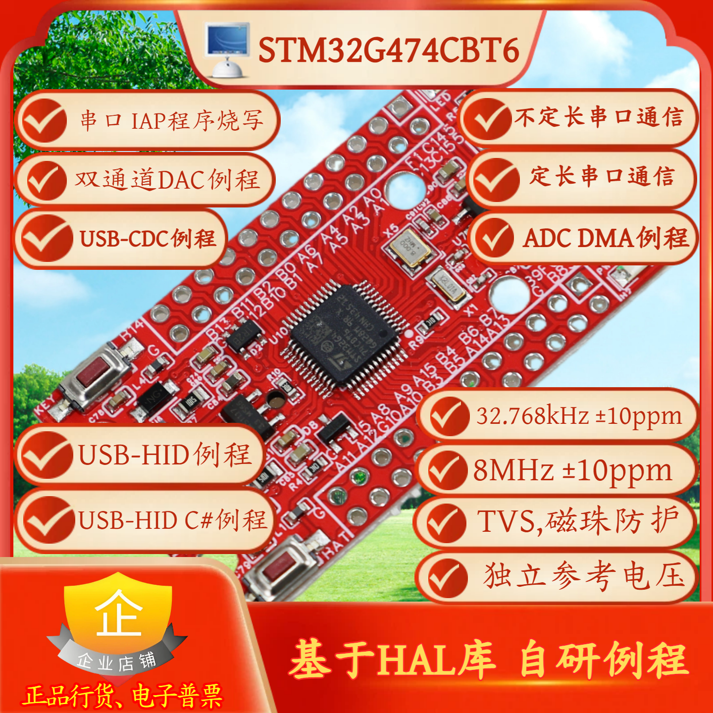 基于STM32G474CBT6的微型USB总线开发板,ADC参考电压独立供电,不受负载影响。此开发板背面预留CR1220电池座,客户在需要的时候,可以自行焊接。本案提供以下例程: